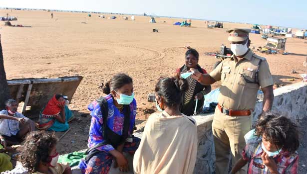மெரினா கடற்கரையில் நரிக்குறவர்கள் பலர் குடும்பத்தோடு அமர்ந்து இருந்தனர். அவர்களில் பெரும்பாலானவர்கள் மாஸ்க் அணியாமல் இருந்தனர். இதையடுத்து உதவி கமிஷனர் பாஸ்கர் அவர்களுக்கு மாஸ்க் வழங்கி கொரோனா விழிப்புணர்வை ஏற்படுத்தினார்.