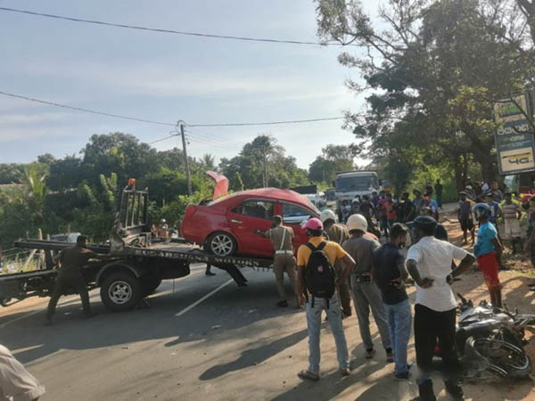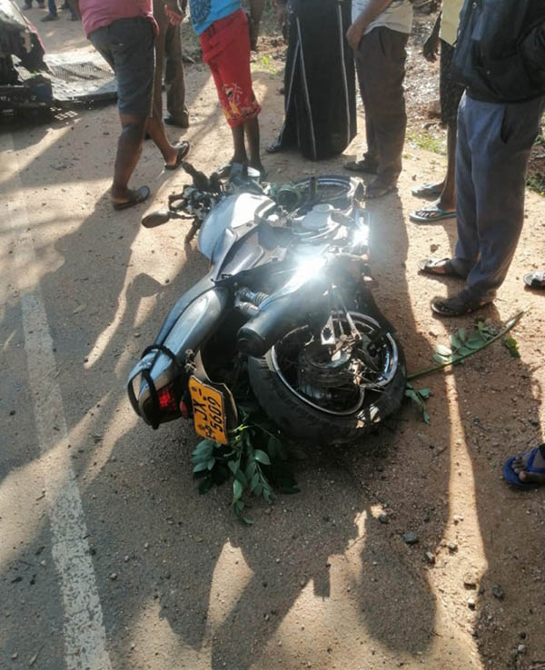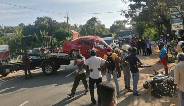 குறித்த சம்பவம் இன்று (30.03.2021) காலை 7.45 மணியளவில் இடம்பெற்றுள்ளதாக பொலிஸார் தெரிவித்துள்ளனர். கொழும்பிலிருந்து திருகோணமலை நோக்கி வந்து கொண்டிருந்த கார் ஐந்தாம் கட்டை பகுதியில் வீதியோரத்தில் நின்று கொண்டிருந்த மோட்டார் சைக்கிளுடன் மோதியதில் இந்த விபத்து நேர்ந்துள்ளதாக தெரியவருகிறது.