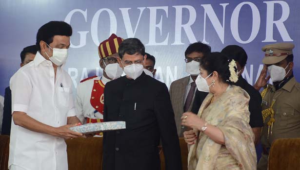 கவர்னர் ஆர்.என்.ரவிக்கு முதல்-அமைச்சர் மு.க.ஸ்டாலின் புத்தகம் பரிசு வழங்கி வாழ்த்தினார். ஆர்.என்.ரவியின் மனைவிக்கு மு.க.ஸ்டாலின் பொன்னாடையை பரிசாக வழங்கினார். தலைமை நீதிபதி சஞ்சீவ் பானர்ஜி மலர் கொத்துகளை ஆர்.என்.ரவிக்கும், அவரது மனைவிக்கும் வழங்கினார்.