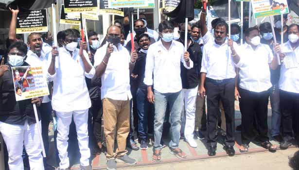 விடுதலை சிறுத்தைகள் கட்சி தலைவர் திருமாவளவன் சென்னை அசோக் நகரில் உள்ள கட்சி அலுவலகத்தில் கருப்பு கொடி ஏந்தி ஆர்ப்பாட்டத்தில் ஈடுபட்டார். இதில் வன்னியரசு மற்றும் நிர்வாகிகள் கலந்துகொண்டனர்.