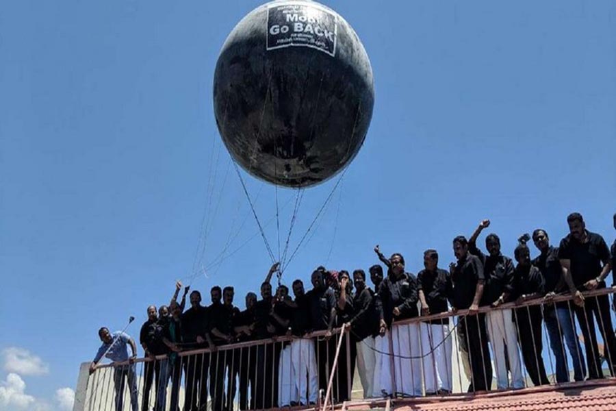 மோடியே திரும்பிப்பிப்போ கருப்பு கலரில் ராட்சத பலூன்களை பறக்கவிட்டனர். இதனால் அதிர்ந்த போலீசார் முடிந்தமட்டிலும் பலூன்களை ஊசி வைத்து வெடிக்க வைத்தனர்.