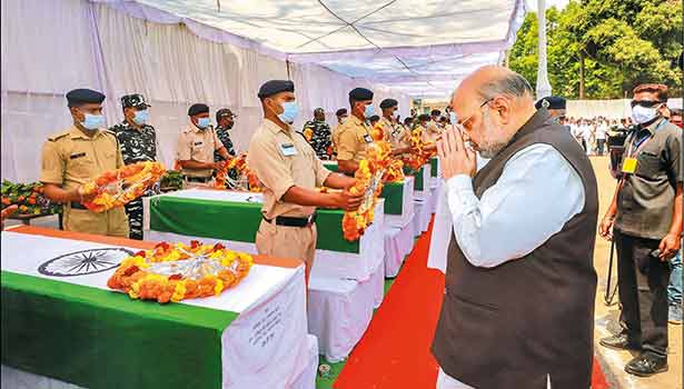 இந்தநிலையில், அமித்ஷா நேற்று சத்தீஸ்காருக்கு நேரில் சென்றார். நக்சலைட்டு ஆதிக்கம் மிகுந்த பஸ்தார் மாவட்டம் ஜகதால்பூருக்கு சென்றடைந்தார். அங்கு துப்பாக்கி சண்டையில் பலியான வீரர்களின் உடல்களுக்கு அமித்ஷா அஞ்சலி செலுத்தினார்.