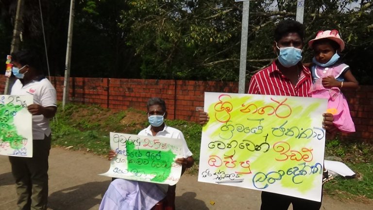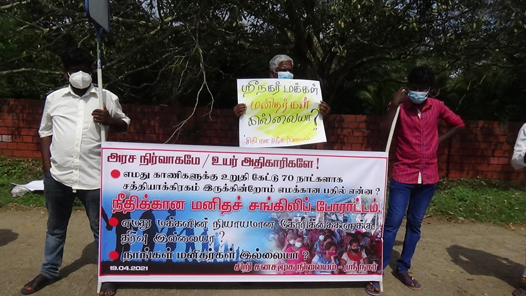நூற்றுக்கணக்கான மக்கள் குறித்த போராட்டத்தில் கலந்து கொண்டிருந்ததுடன், ஶ்ரீநகர் மக்கள் மனிதர்கள் இல்லையா, காணி உறுதிபத்திரத்தை வழங்கு, 26 வருடங்களாக எம்மை ஏமாற்றுவது சரியா, நியாயமான கோரிக்கைகளிற்கு தீர்வு என்ன போன்ற வாசகங்கள் எழுதிய பதாதைகளை ஏந்தியிருந்ததுடன் கோசங்களையும் எழுப்பியிருந்தனர்.
