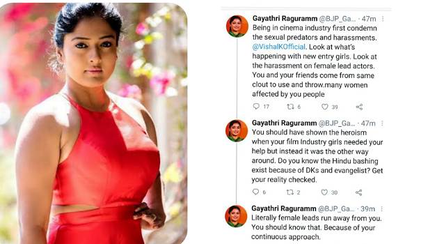 தமிழ் சினிமாவில் நடன இயக்குனர், நடிகையுமான இருப்பவர் காயத்ரி ரகுராம். இவர் தற்போது பாஜக கட்சியில் இணைந்து அரசியலில் ஈடுபட்டு வருகிறார். இந்நிலையில் இவர் நடிகர் விஷால் மீது பாலியல் புகார் கூறி இருக்கிறார்.