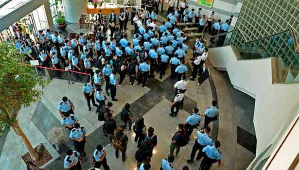 இந்த நிலையில் ஆப்பிள் டெய்லி பத்திரிகை தேசிய பாதுகாப்பு சட்டத்தை மீறியதாக கூறி நேற்று 500-க்கும் மேற்பட்ட போலீசார் அந்த பத்திரிகை அலுவலகத்துக்குள் அதிரடியாக நுழைந்து சோதனை நடத்தினர்.