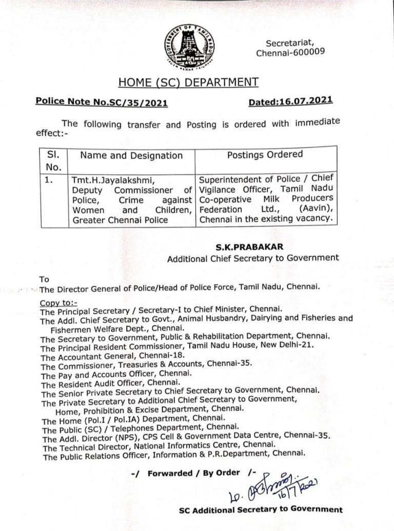 இந்நிலையில் சென்னை காவல்துறை பெண்கள் மற்றும் குழந்தைகளுக்கு எதிரான குற்றத்தடுப்புப் பிரிவு துணை ஆணையர் எச். ஜெயலட்சுமி, தமிழ்நாடு கூட்டுறவு பால் உற்பத்தியாளர்கள் கூட்டமைப்பு லிமிடெட் (ஆவின்) பிரிவில் தலைமை விஜிலென்ஸ் அதிகாரியாக நியமிக்கப்பட்டுள்ளார்.