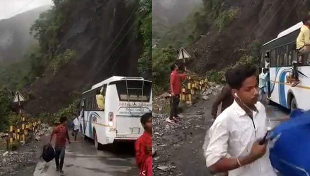 திடீரென மலைப்பகுதியில் நிலச்சரிவு ஏற்பட்டது. இந்த நிலச்சரிவால் மண், கற்கள் இவற்றுடன் மரங்களும் வேருடன் சாய்ந்து சாலையில் விழுந்தன. இதையறிந்த பேருந்து ஓட்டுனர் உஷாராக வண்டியை முன்பே நிறுத்திவிட்டார்.