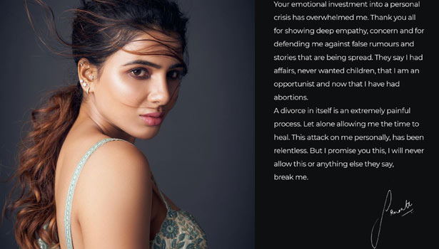இவை அனைத்துக்கும் முற்றுப்புள்ளி வைக்கும் வகையில் நடிகை சமந்தா தனது டுவிட்டர் பக்கத்தில் அறிக்கை ஒன்றை வெளியிட்டுள்ளார். அதில் அவர் கூறியிருப்பதாவது: “என் சொந்த பிரச்சினையில் நீங்கள் காட்டிய உணர்வுகள் என்னை நெகிழ்ச்சி அடைய வைத்துள்ளது. என் மீது வைக்கப்பட்ட பொய்யான வதந்தி மற்றும் கதைகளுக்கு எதிராக நீங்கள் காட்டிய அனுதாபத்திற்கு நன்றி.