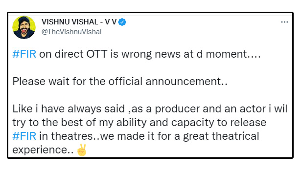 இந்நிலையில், இதுகுறித்து விளக்கமளித்துள்ள நடிகர் விஷ்ணு விஷால், டுவிட்டரில் பதிவிட்டுள்ளதாவது: “இது தவறான செய்தி. விரைவில் இப்படம் குறித்து அதிகாரப்பூர்வ அறிவிப்பு வெளியாகும். ஒரு தயாரிப்பாளராகவும், நடிகராகவும், நான் இந்த படத்தை திரையரங்கில் வெளியிடவே விரும்புகிறன். சிறந்த திரையரங்க அனுபவத்தை கொடுக்கும் விதமாக இப்படத்தை உருவாக்கி இருக்கிறோம்” என அவர் கூறியுள்ளார்.