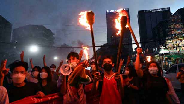 இதனை தொடர்ந்து ராணுவ ஆட்சிக்கு எதிராக அங்கு மாபெரும் போராட்டம் வெடித்தது. நாட்டில் ஜனநாயகத்தை மீட்டெடுக்க கோரியும், சிறை வைக்கப்பட்டுள்ள அரசியல் தலைவர்களை உடனடியாக விடுவிக்க வலியுறுத்தியும் பல்லாயிரக்கணக்கான மக்கள் வீதியில் இறங்கி போராட்டம் நடத்தி வருகின்றனர். அதேவேளை ராணுவ ஆட்சிக்கு எதிராக பல்வேறு கிளர்ச்சியாளர்கள் குழுக்களும் உருவாகியுள்ளது. இந்த குழுக்களுக்கும், ராணுவத்திற்கும் இடையே அவ்வப்போது மோதல் நடைபெற்று வருகிறது.