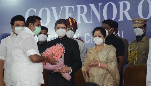 10.30 மணிக்கு முதல்- அமைச்சர் மு.க.ஸ்டாலின், தலைமை நீதிபதி சஞ்சீவ் பானர்ஜி, தலைமை செயலாளர் இறையன்பு ஆகியோர் ஆர்.என்.ரவியை அழைத்து வந்தனர். விழா மேடையில் ஆர்.என்.ரவி, அவரது மனைவி, முதல்-அமைச்சர் மு.க. ஸ்டாலின், தலைமை நீதிபதி சஞ்சீவ் பானர்ஜி, தலைமை செயலாளர் இறையன்பு ஆகியோர் அமர்ந்து இருந்தனர். இதையடுத்து 10.33 மணிக்கு காவல்துறையின் இசைக்குழு இசைத்த தேசிய கீதத்துடன் விழா தொடங்கியது.