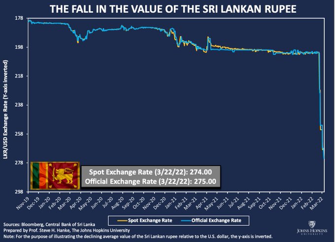 2022ம் ஆண்டு ஜனவரி முதலாம் திகதி முதல் அமெரிக்க டொலருக்கு நிகரான இலங்கை ரூபாயின் பெறுமதி 26% குறைந்துள்ளதாக ஜோன்ஸ் ஹாப்கின்ஸ் பல்கலைக்கழகத்தின் பேராசிரியரான உலகப் புகழ்பெற்ற பொருளாதார நிபுணர் ஸ்டீவ் ஹாங்க் தெரிவித்துள்ளார்.