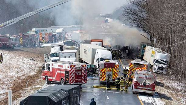 எதிரே வரும் வாகனங்கள் தெரியாத அளவுக்கு பனிப்பொழிவு இருந்ததால் நெடுஞ்சாலையில் சென்று கொண்டிருந்த வாகனங்கள் பல அடுத்தடுத்து விபத்தில் சிக்கின. சாலையில் வாகனங்கள் விபத்துக்குள்ளாகி கிடப்பது தெரியாமல், ஒன்றன்பின் ஒன்றாக வந்த மற்ற வாகனங்களும் விபத்துக்குள்ளாகி கிடந்த வாகனங்கள் மீது மோதி கவிழந்தன.