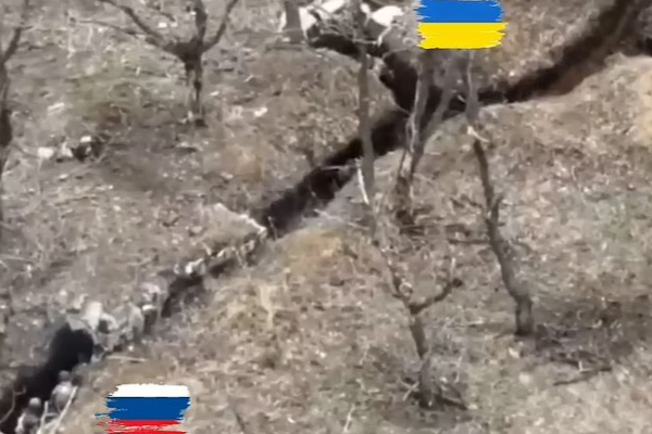 முதல் உலகப்போர்க்காலத்தில் நடந்ததுபோல, பதுங்கு குழிகளுக்குள் இருந்தவாறு அந்த வீரருக்கும் ரஷ்யப்படையினருக்கும் நடக்கும் போர், ட்ரோன் ஒன்றின் மூலம் படம்பிடிக்கப்பட்டுள்ளது.