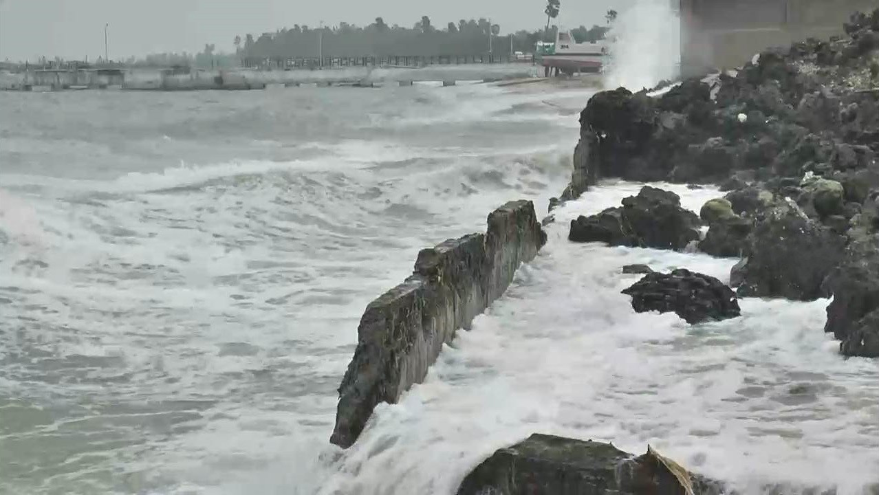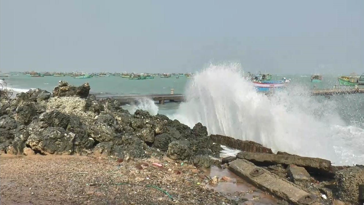 இதனால் கடலில் எழும் அலைகள் கடற்கரை ஓரம் உள்ள இந்திய கடலோர காவல் படை முகாம் சுவற்றின் மீது மோதி ராட்சத அலைகள் எழுந்து வருகிறது.