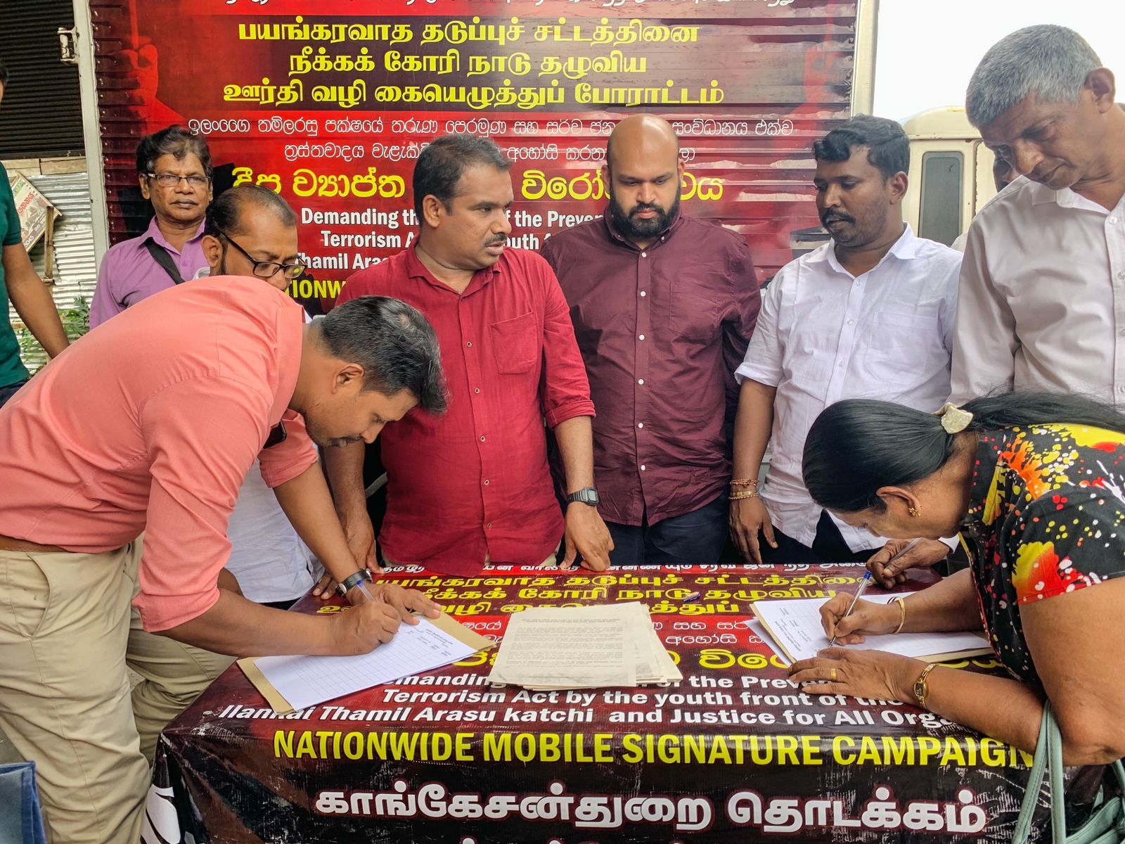 பயங்கரவாத தடை சட்டத்தினை நீக்குமாறு வலியுறுத்தி இலங்கை தமிழரசு கட்சியின் ஏற்பாட்டில் காங்கேசன்துறை முதல் ஹம்பாந்தோட்டை வரையில் கையெழுத்துப் போராட்டம் முன்னெடுக்கப்பட்டு வருகின்றது.