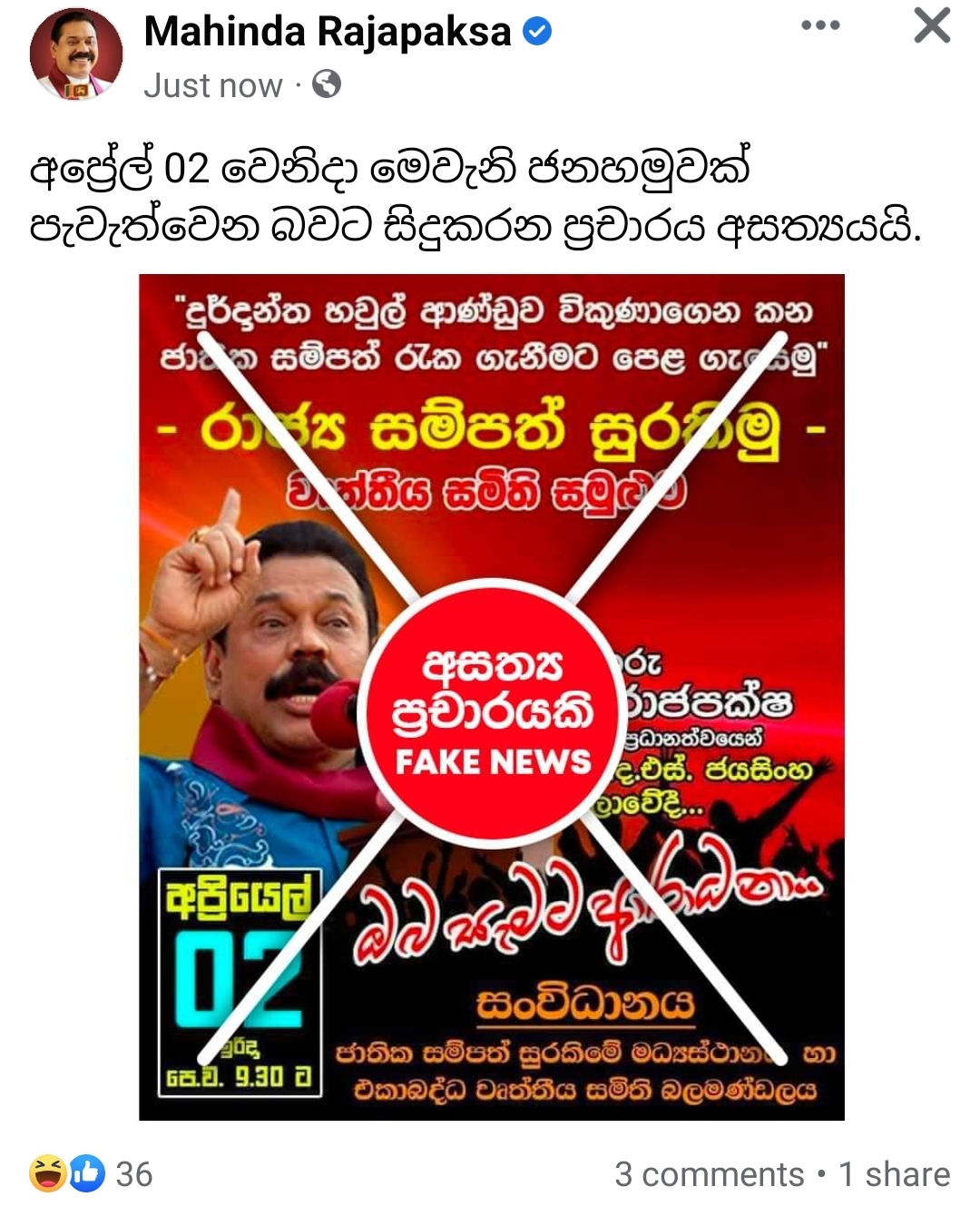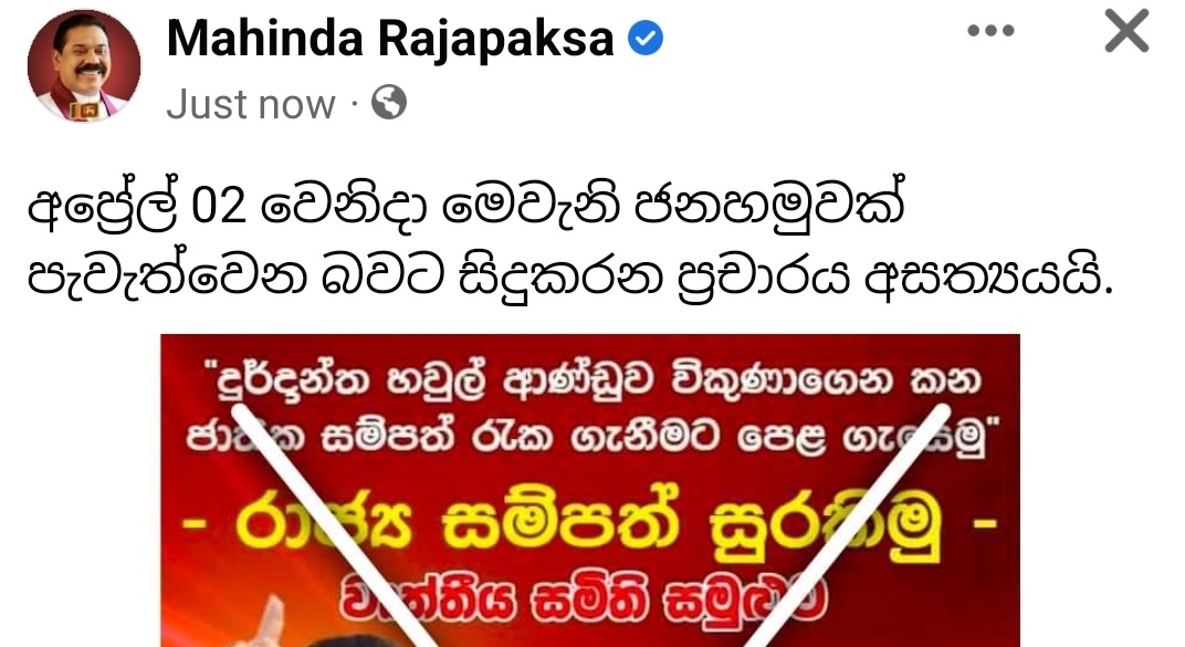 “முன்னாள் ஜனாதிபதி தலைமையில் ஏப்ரல் 2ஆம் திகதி பொதுக்கூட்டம் நடைபெறவுள்ளது” என சமூக ஊடகங்களில் ஒரு செய்தி பரப்பப்பட்டுள்ளது.