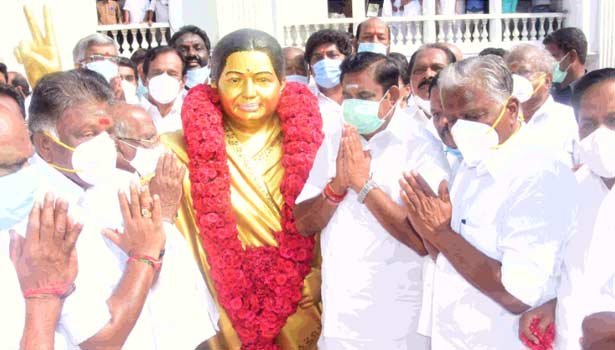 அங்குள்ள ஜெயலலிதா சிலை வளாகம் மலர்களால் அலங்கரித்து வைக்கப்பட்டு இருந்தது. கட்சியின் ஒருங்கிணைப்பாளர் துணை முதல்-அமைச்சர் ஒ.பன்னீர்செல்வம், இணை ஒருங்கிணைப்பாளர் முதல்-அமைச்சர் எடப்பாடி பழனிசாமி ஆகிய இருவரும் ஜெயலலிதாவின் சிலைக்கு மாலை அணிவித்து, மலர் தூவி வணங்கி மரியாதை செலுத்தினார்கள்.