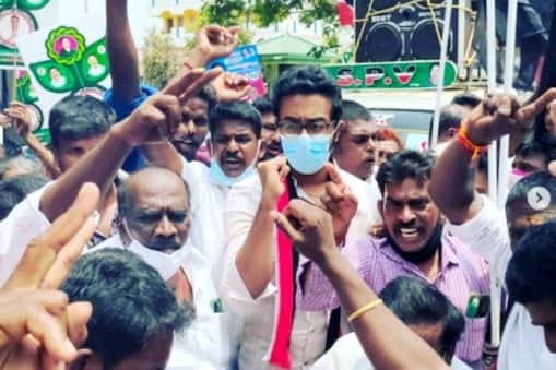 கோவை சுகுணாபுரத்தில் நடைபெற்ற கண்டன ஆர்ப்பாட்டத்தில் அதிமுக கட்சித் துண்டு அணிந்து கலந்துகொண்டார் அமைச்சர் எஸ்.பி.வேலுமணியின் மகன் விகாஷ்.