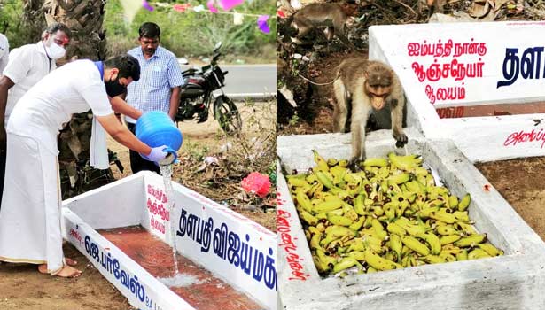 இந்நிலையில், குரங்குகள் கஷ்டப்படுவதை அறிந்த புதுக்கோட்டை விஜய் மக்கள் இயக்கத்தினர், அந்தக் கோவில் அருகே தண்ணீர் தொட்டி ஒன்றை அமைத்துள்ளனர். மேலும் அந்த தண்ணீர் தொட்டி அருகே பழங்கள், உணவுகளை வைப்பதற்கு ஒரு மேடையும் அமைத்து, அதன்மூலம் குரங்குகளுக்கு தினந்தோறும் தண்ணீர், உணவுப் பொருட்கள் மற்றும் பழங்களை விஜய் மக்கள் இயக்கத்தினர் வழங்கி வருகின்றனர். அவர்களின் இந்த செயலுக்கு பாராட்டுக்கள் குவிந்து வருகின்றன.