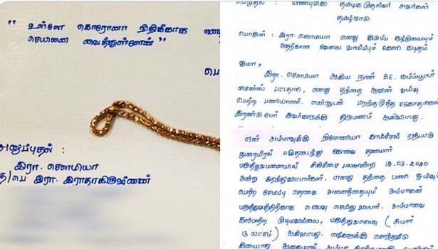 அந்த கடிதத்தில், ‘என்னிடம் பணம் இல்லாததால் கொரோனா நிதித்தொகையாக எனது கழுத்தில் இருந்த 2 பவுன் தங்கச்சங்கிலியை நிதியாக கொடுக்க விரும்புகிறேன் என்று கூறியிருந்தார். மேலும் தனது குடும்பசூழ்நிலையை விளக்கியதுடன், எனக்கு வேலைவாய்ப்பை உருவாக்கி கொடுத்தால் நன்றியுடன் இருப்பேன். எனக்கு அரசினர் வேலை வேண்டும் என்று எதிர்பார்க்கவில்லை. எனது ஊரின் அருகில் உள்ள தனியார் நிறுவனத்தில் வேலைவாய்ப்பை உருவாக்கி கொடுத்தால்கூட போதும் என்பதை தாழ்மையுடன் கேட்டுக்கொள்கிறேன்” என்று கூறியிருந்தார்.