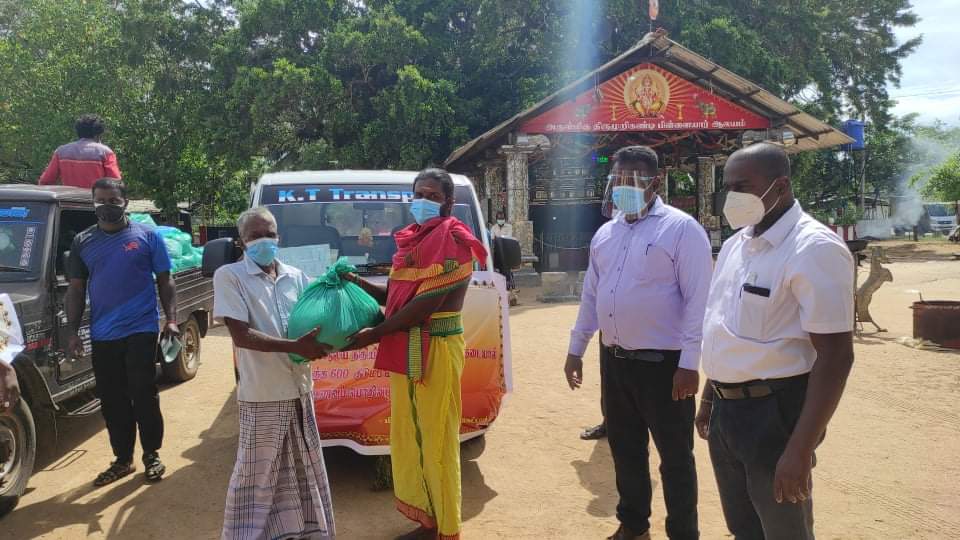 ஆலய வளாகத்தில் இருந்து பிரதேச செயலக அதிகாரிகள் வாகனங்களில் பொருட்களை ஏற்றிச் சென்று வீடு வீடாக உலர் உணவு பொருட்களை மக்களுக்கு கையளித்தனர்.