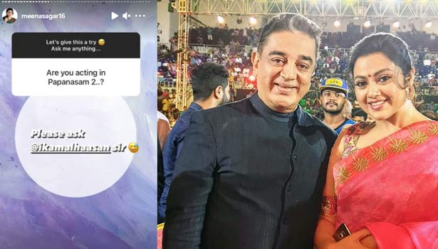 இதுதவிர பாபநாசம் படத்தின் இரண்டாம் பாகத்தில் கமலுக்கு ஜோடியாக மீனா நடிக்க உள்ளதாகவும் செய்திகள் வலம் வந்தன. இந்நிலையில், சமீபத்தில் சமூக வலைதளம் வாயிலாக கலந்துரையாடிய நடிகை மீனாவிடம், ரசிகர் ஒருவர் ‘பாபநாசம் 2-வில் நீங்கள் நடிப்பீர்களா?’ என கேள்வி எழுப்பினார். இதற்கு பதிலளித்த அவர், அதை நடிகர் கமலிடம் கேளுங்கள் என்று கூறியுள்ளார்.