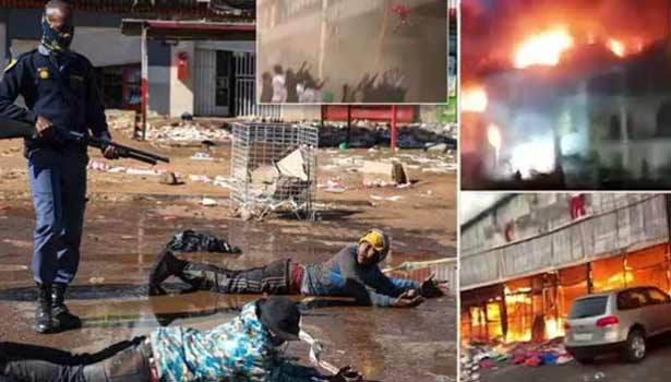 ஜோகன்னஸ்பர்க்கில் உள்ள சோவெட்டோவில் உள்ள ஒரு வணிக வளாகத்தில் கொள்ளையடிக்க முயன்றபோது ஏற்பட்ட நெரிசலில் 10 பேர் கொல்லப்பட்டனர். அப்போது நெருப்பில் சிக்கிய ஒரு பெண் தனது குழந்தையை கீழே நின்றவர்களிடம் தூக்கி வீசினார். இறுதியில் அந்த வணிக வளாகம் வன்முறையாளர்களால் தீக்கிரையாக்கப்பட்டது.