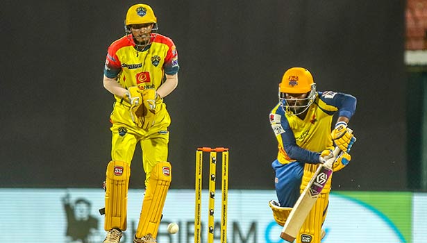 தொடக்க ஆட்டகாரர் சுரேஷ்குமார் 58 ரன்னில் அவுட்டானார். முதல் விக்கெட்டுக்கு கங்கா ஸ்ரீதர் ராஜு ஜோடி 108 ரன்கள் சேர்த்தது. கங்கா ஸ்ரீதர் ராஜா 57 பந்துகளில் 7 சிக்சர், 6 பவுண்டரி உள்பட 90 ரன்கள் எடுத்தும், சாய் சுதன் 40 ரன்னும் எடுத்து ஆட்டமிழக்காமல் இருந்தார்
