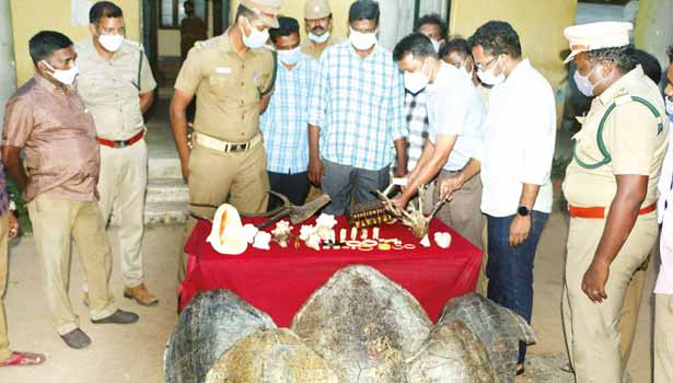 அப்போது கடையில் ஆமை ஓடுகள், மான் கொம்பு, அரிய வகை சங்கு, கடல் விசிறி, முள்ளம்பன்றி உடலில் இருக்கும் முட்களால் செய்யப்பட்ட கலை பொருட்கள், மற்றும் யானை தந்தந்தால் செய்யப்பட்ட அரிய பொருட்கள் இருந்தது தெரியவந்தது. அவை அரசால் விற்பனைக்கு தடை செய்யப்பட்ட பொருட்கள் ஆகும்.