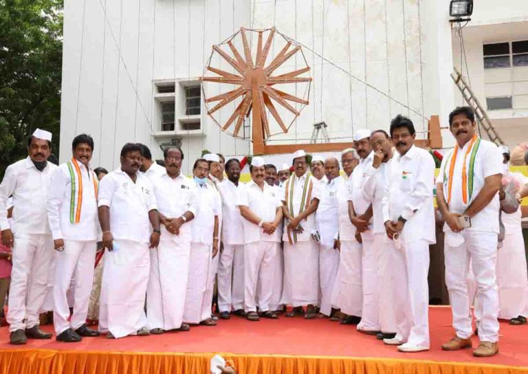 அப்போது, சத்தியமூர்த்தி பவன் முகப்பில் அமைக்கப்பட்டிருந்த காந்தியின் கைராட்டையை திறந்துவைத்தார் கே. எஸ். அழகிரி. இதில் நடிகர் சிவகுமார் பங்கேற்றார். சேவாதள தொண்டர்கள் அணியும் வெள்ளை குல்லாவை அணிந்து நடிகர் சிவகுமார் அந்த நிகழ்வில் பங்கேற்றார் . நிகழ்வில், கே.எஸ்.அழகிரிக்கு காந்தி பற்றிய புத்தகம் ஒன்றினையும் அளித்தார் சிவகுமார்.