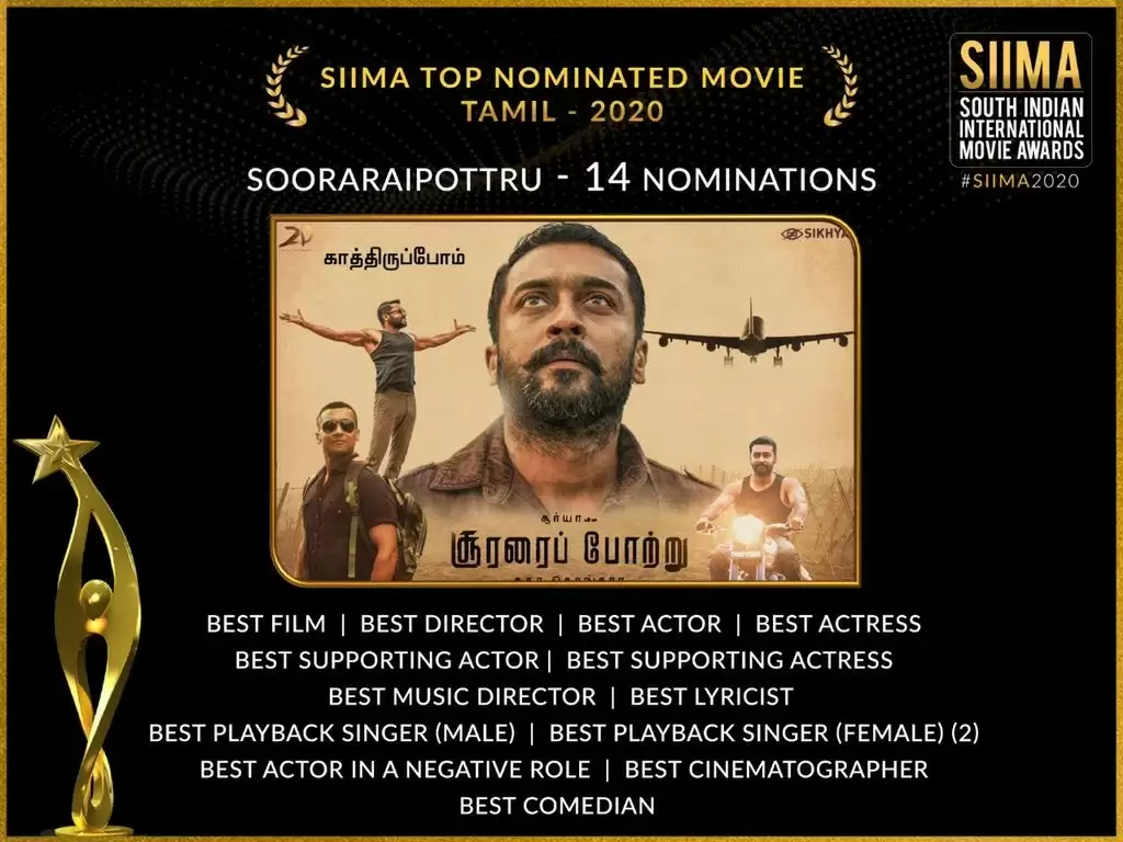 சூரரைப் போற்று' திரைப்படம் 2020-ம் ஆண்டிற்கான தென்னிந்திய சைமா விருத்திற்காக 14 பிரிவில் போட்டிக்காகத் தேர்வு செய்யப்பட்டுள்ளது.